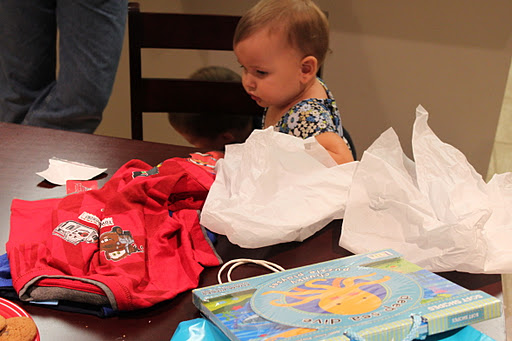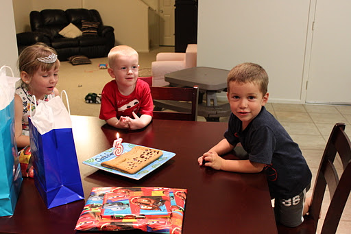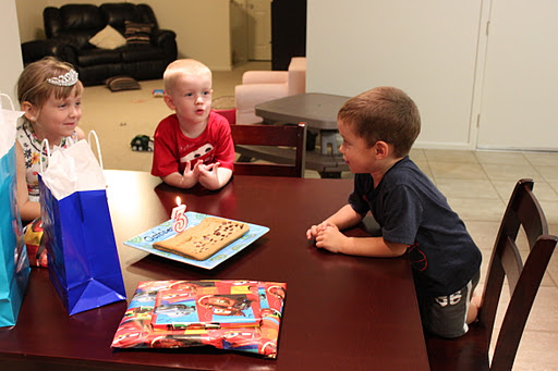 So we made a chocolate chip cookie party!! Jake got a giant cookie with his name spelled out in chocolate chips!! (Which Eric made by the way! GO DAD!!)