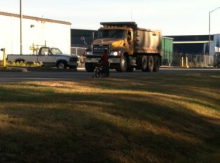 Hannah and Grampa stopping to wave at EVERY dump truck that drove by….