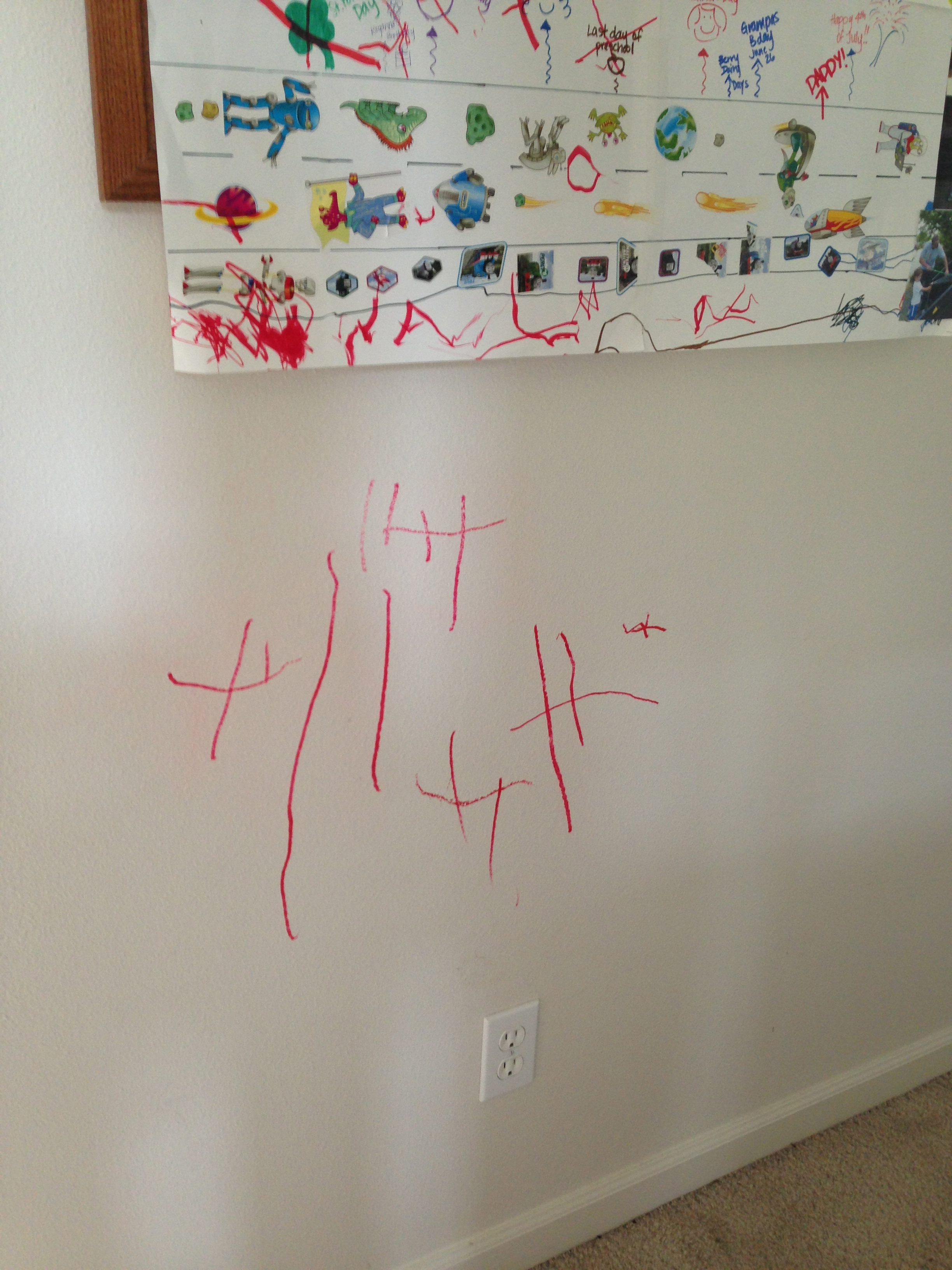 To give my girl a little credit, I see she did start on the Daddy Countdown Track poster where we mark off life events until Eric returns….but slowly that pristine white wall became just too much temptation. We definitely needed a few H’s to spruce up the joint.