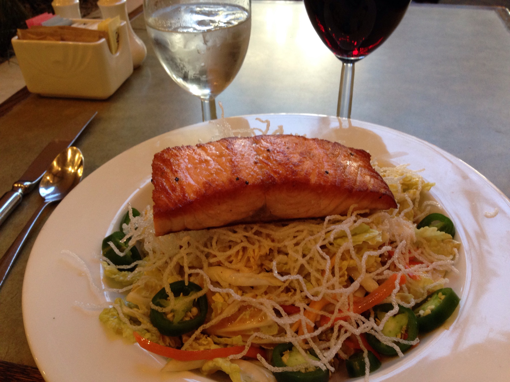 Definitely delicious! Not only because it was yummy salmon and fresh veggies, but I didn’t cook it! And the bonus? Eating uninterrupted!