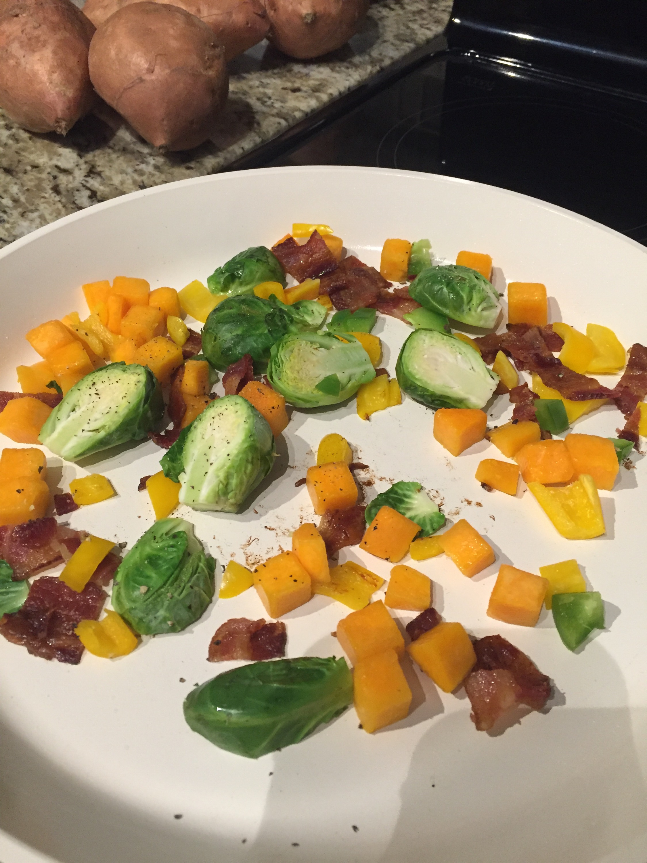Starting with a couple of strips of bacon (uncured, not made with sugar), diced bell peppers, cubed butternut squash, and a handful of Brussels sprouts were added.