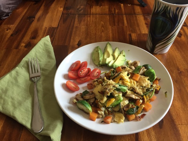 Pausing for lunch, I decided to try my hand at a brunchy scramble. I love scrambles and stir-fries because of the single pan to clean up, and it’s also a great way to incorporate a TON of veggies, not to mention clean out the fridge of odds and ends!
