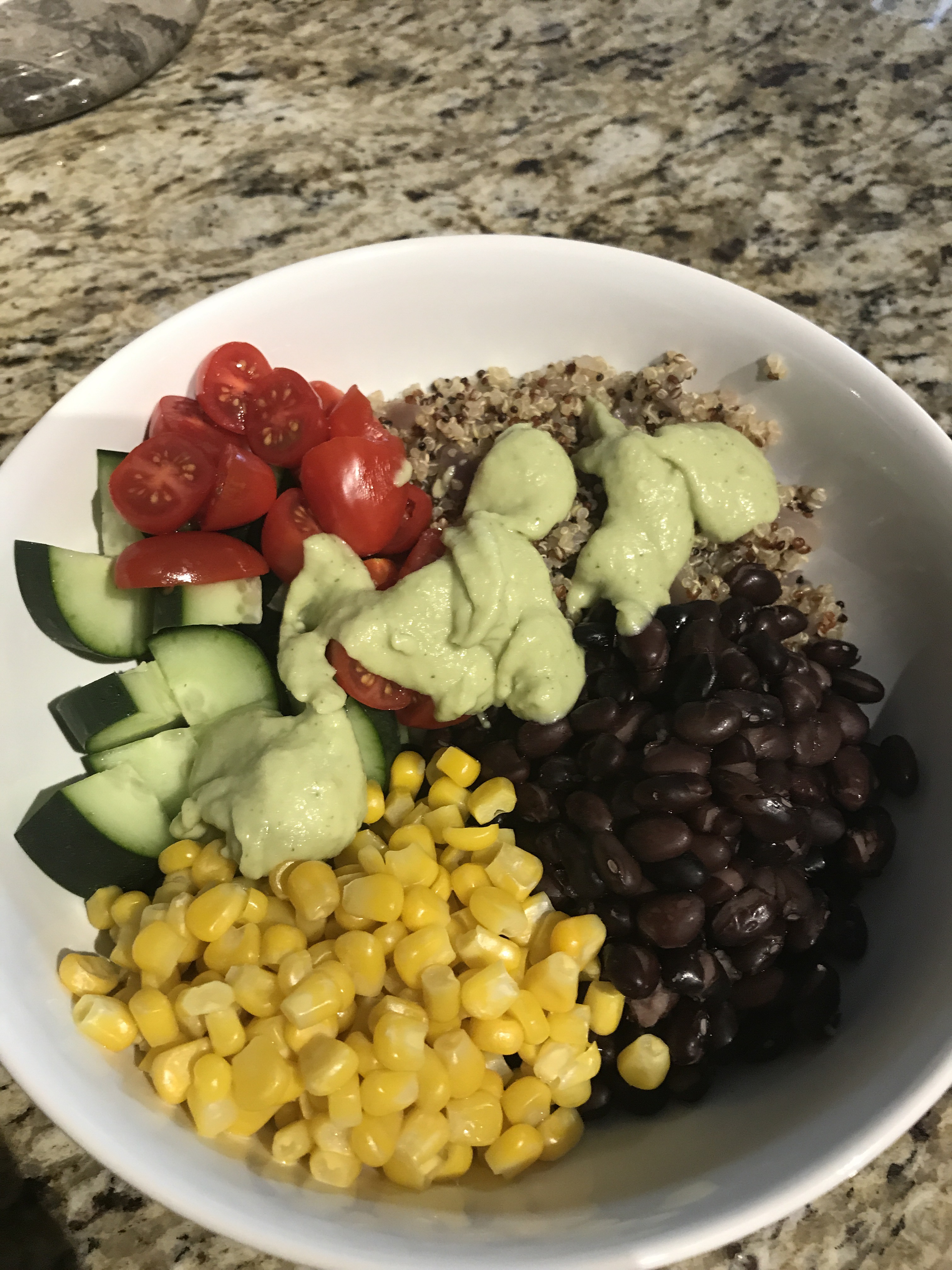 The rest of the bowl came together very quickly; tri color quinoa, diced cherry tomatoes, diced cucumbers, black beans, and corn. Top it all off with the avocado salsa and enjoy! Next time I may place this on a bed of mixed greens and add some sautéed peppers and onions.