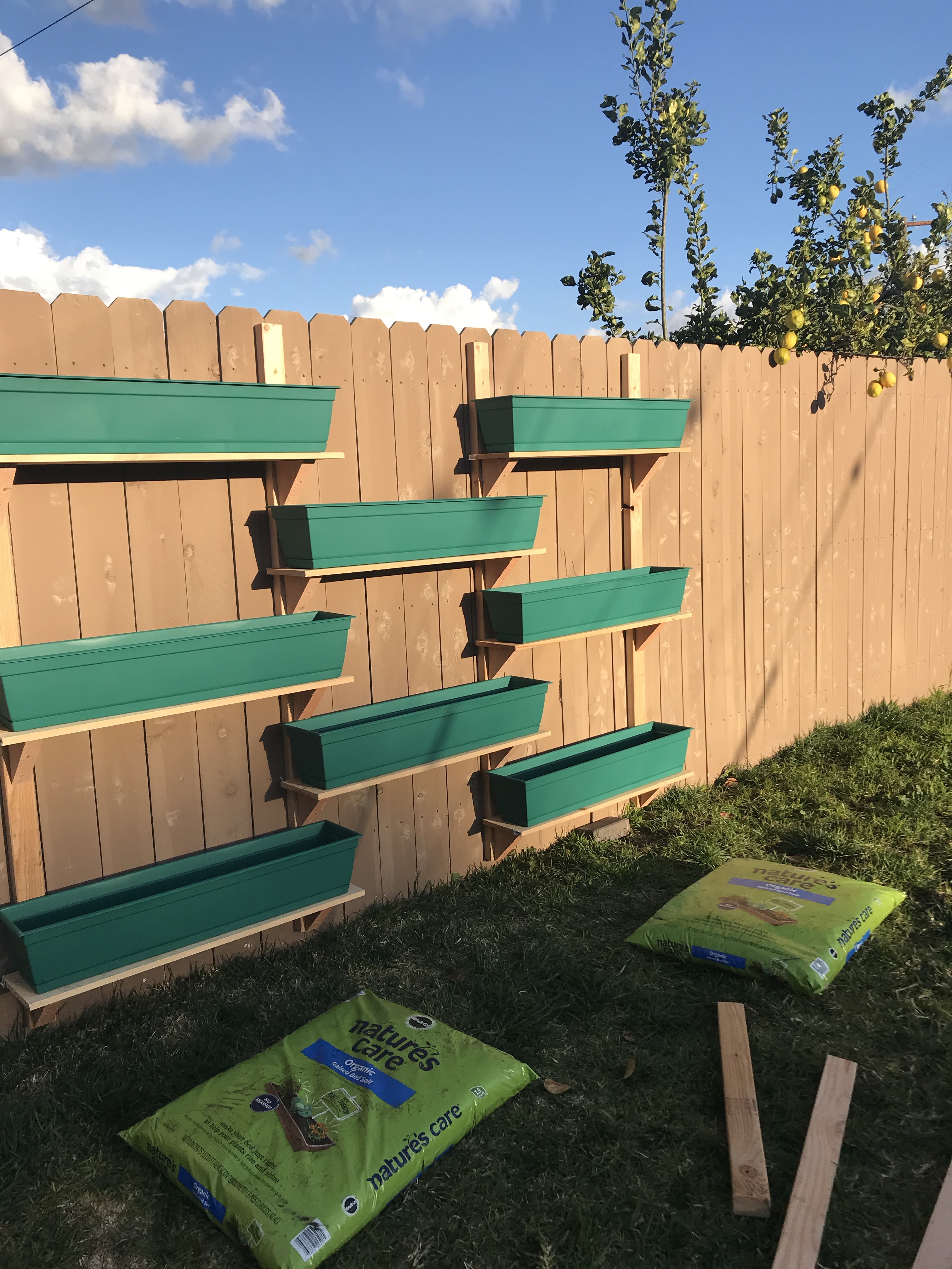 I showed a picture to the hubby of a planter contraption on Pinterest one evening. He replied, “Hmm. That’s doable.” I didn’t give it much thought, until the next day he brought home supplies and made this! I love it! Yay container gardening!