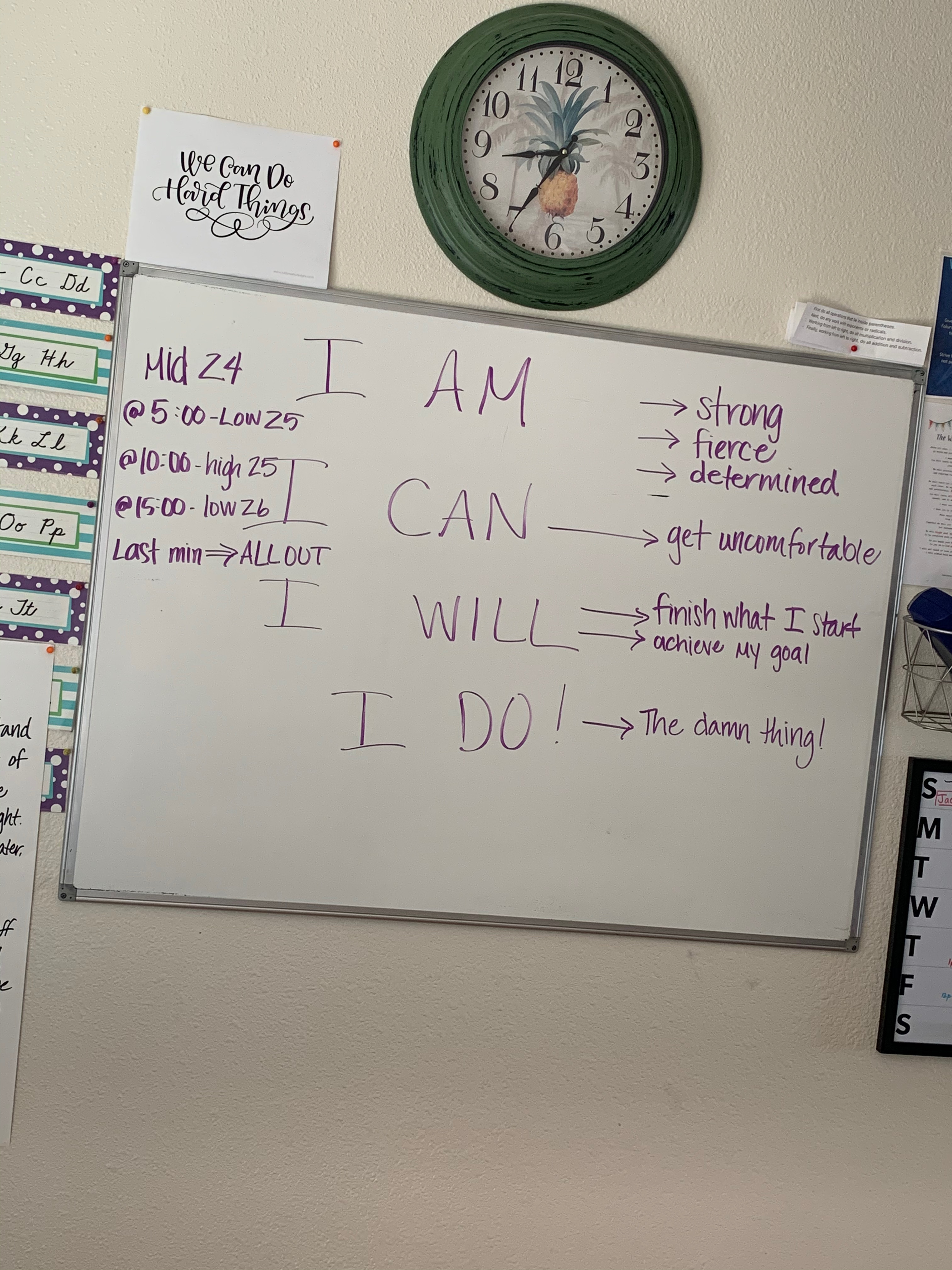 After reading many posts about strategies to attack this FTP monster, analyzing my stats and then setting goals – I climbed on and rode the plan. Complete with corny inspiration and strategy on the school whiteboard that is directly in my sightline as I ride: