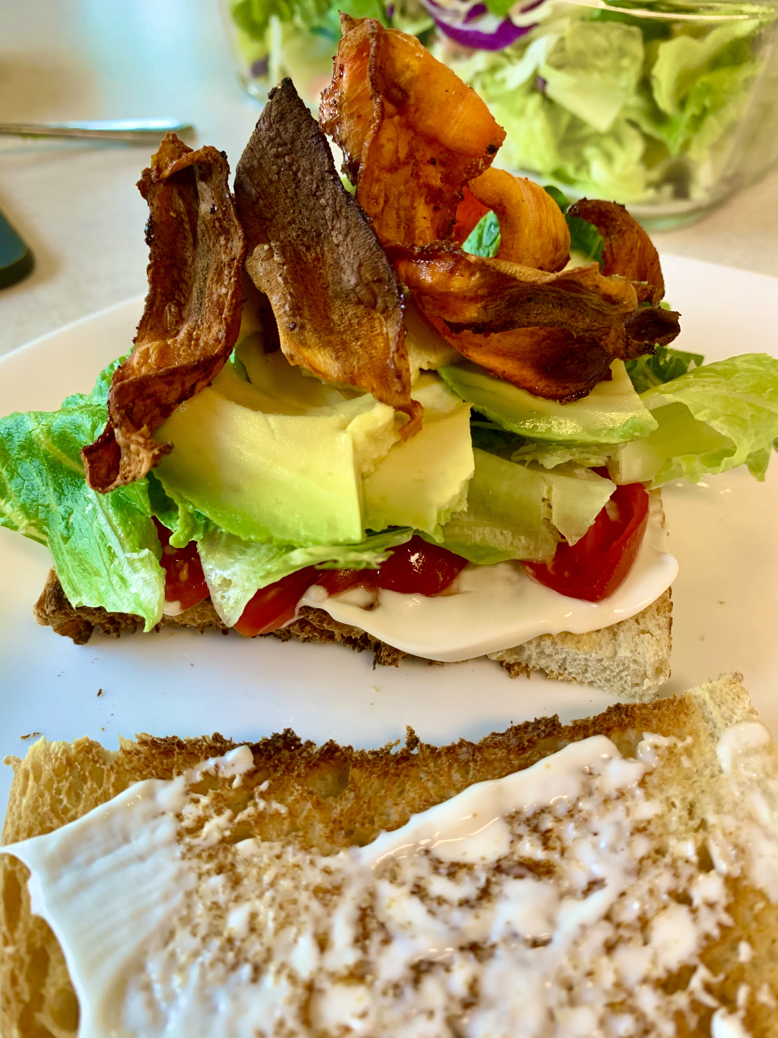 I don’t miss much about eating animals, but one thing I have missed is a really tasty BLT. Or a BLAT (bacon, lettuce, avocado and tomato) on toasted sourdough. There is something about the way the crunchy bread, complete with mayo all up in the nooks and crannies blends with the savory bacon, the creaminess of a ripe avocado, the juice of a fresh Roma tomato slice and crisp leaf lettuce. It really is the perfect sandwich. I grew up with BLTs. It’s handheld comfort food.