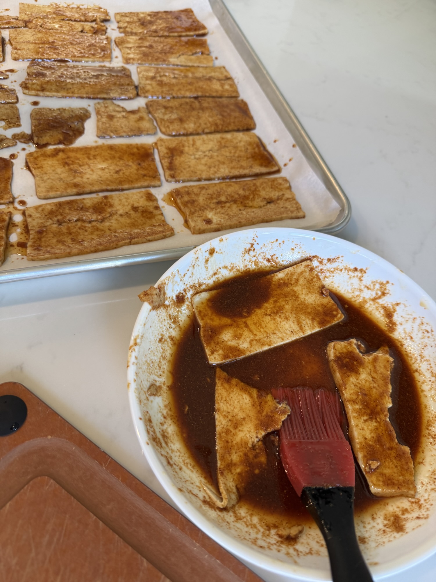 Lay marinated tofu slices on a parchment lined baking sheet. Any add’l marinade can be spread over tofu using a basting brush.