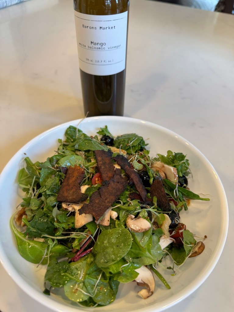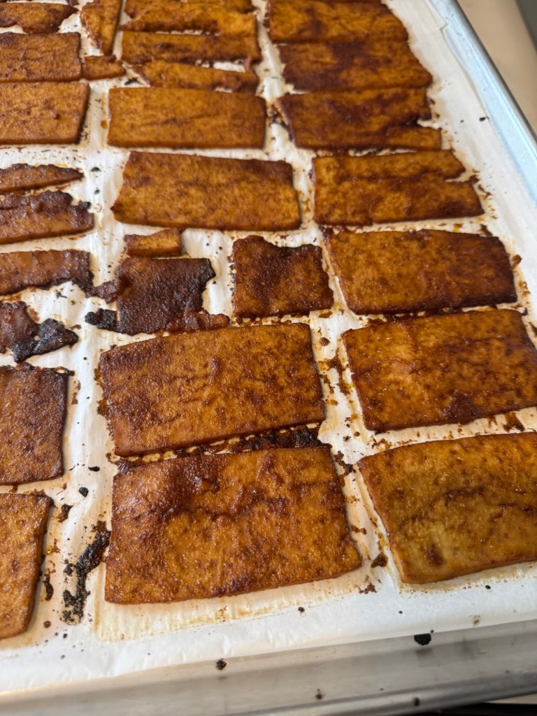 Hannah brought me a recipe for tofu bacon last week. Internally rolling my eyes, I assumed this would be much like other versions of things masquerading as bacon. Bacon is bacon. When I ate meat, I enjoyed it, but I do not really miss it. It’s salty fat. I can live without the heart disease and type 2 diabetes and animal cruelty. I did do some air-fried carrots sliced thin and marinaded as bacon. Not bad, but the payoff didn’t outweigh the prep. With a bazillion other yummy things to taste, I stopped making foods trying to be other foods.